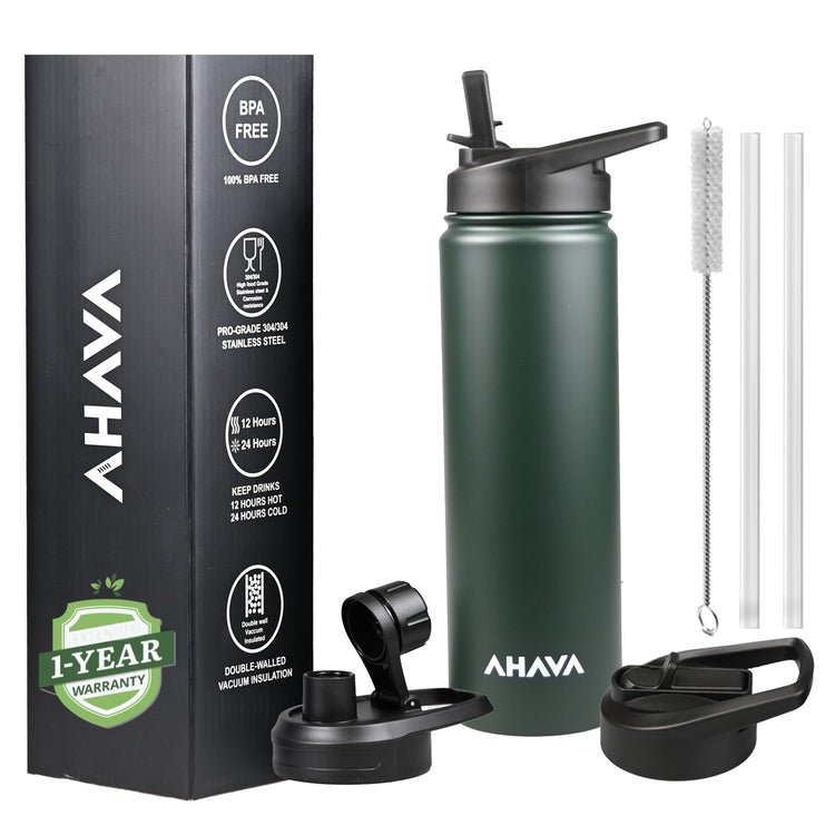 AHAVA 750ml Insulated Water Bottle | 12H Hot, 24H Cold | BPA-Free| 2 Lids: Straw & Spout | Dishwasher Safe, Premium Stainless Steel for Gym, Office, Travel, School (Dark Slate Green)