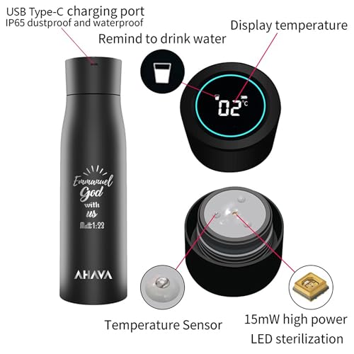 AHAVA 316 Stainless Steel Insulated Water Bottle | Self-Cleaning UV Sterilizer | 12 Hrs Hot &Cold | Smart Temperature Display & Drink Reminder | Christian Gifts (500ml Black)